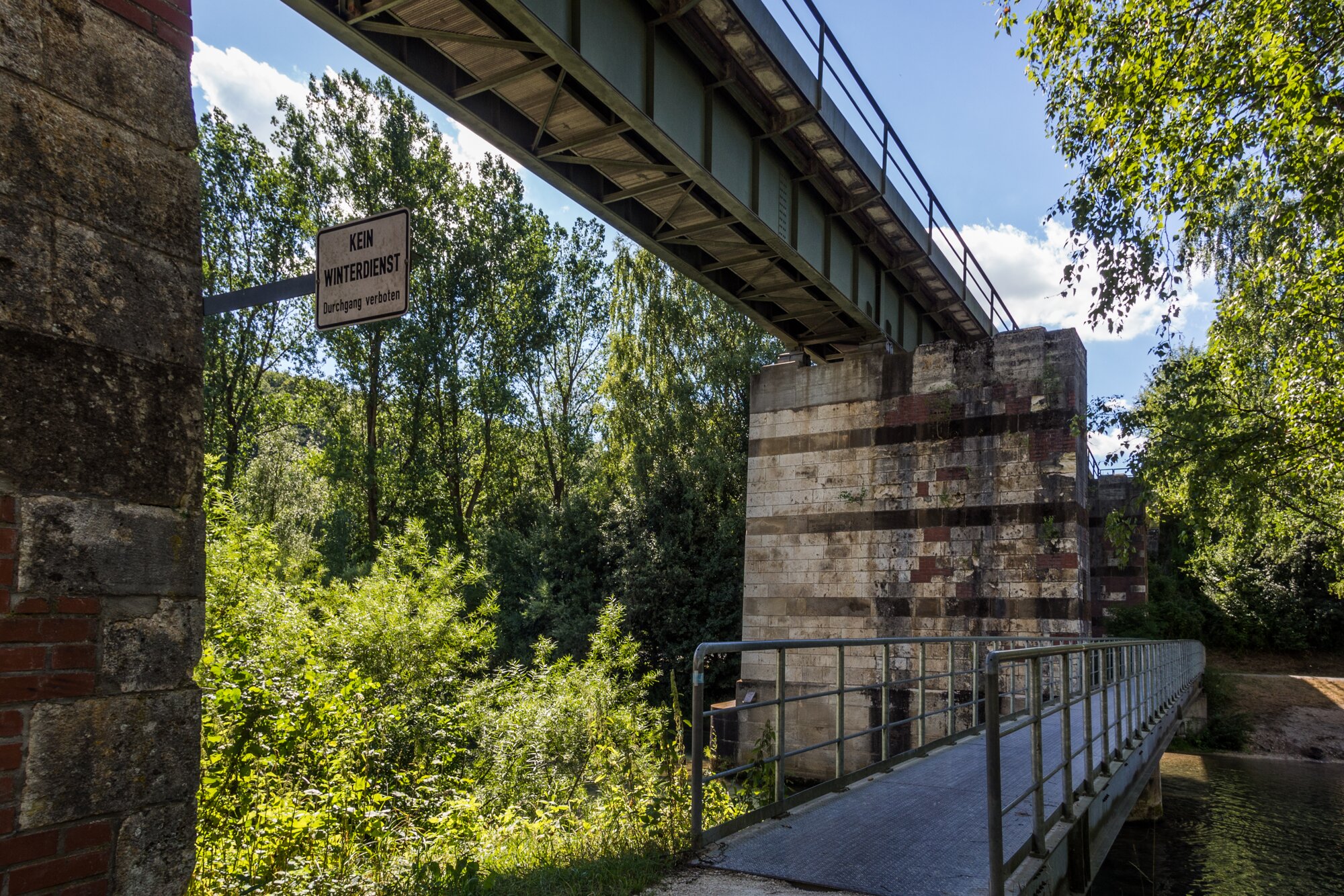 Eisenbahnbrücke an der Blau Zugfahrt von Blaustein nach Herrlingen. Wanderung vom Bahnhof Herrlingen über das Rommel-Denkmal und Wippingen zum Rusenschloss oberhalb von Blaubeuren. Von dort Abstieg zum Bahnhof Blaubeuren und Rückfahrt mit dem Zug nach Blaustein.