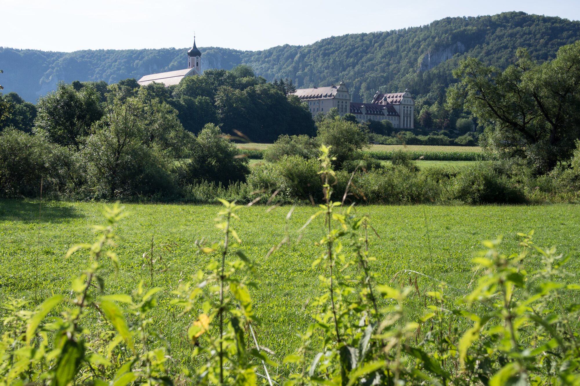 Kloster Beuron vom Donauradweg aus Wanderung im Oberen Donautal: Route: Start am Kloster Beuron - Knopfmacherfels - Jägerhaus (im Donautal) - Ziegelhütte (im Donautal) - Leibfelsen - Stiegelesfelsen - Knopfmacherfels - Kloster Beuron