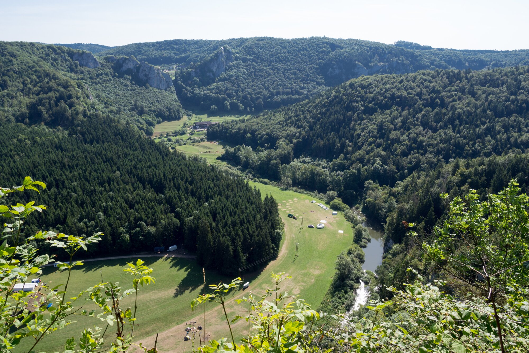 Blick ins Tal vom Knopfmacherfelsen Richtung Jägerhaus und Schloss Bronnen. Wanderung im Oberen Donautal: Route: Start am Kloster Beuron - Knopfmacherfels - Jägerhaus (im Donautal) - Ziegelhütte (im Donautal) - Leibfelsen - Stiegelesfelsen - Knopfmacherfels - Kloster Beuron.