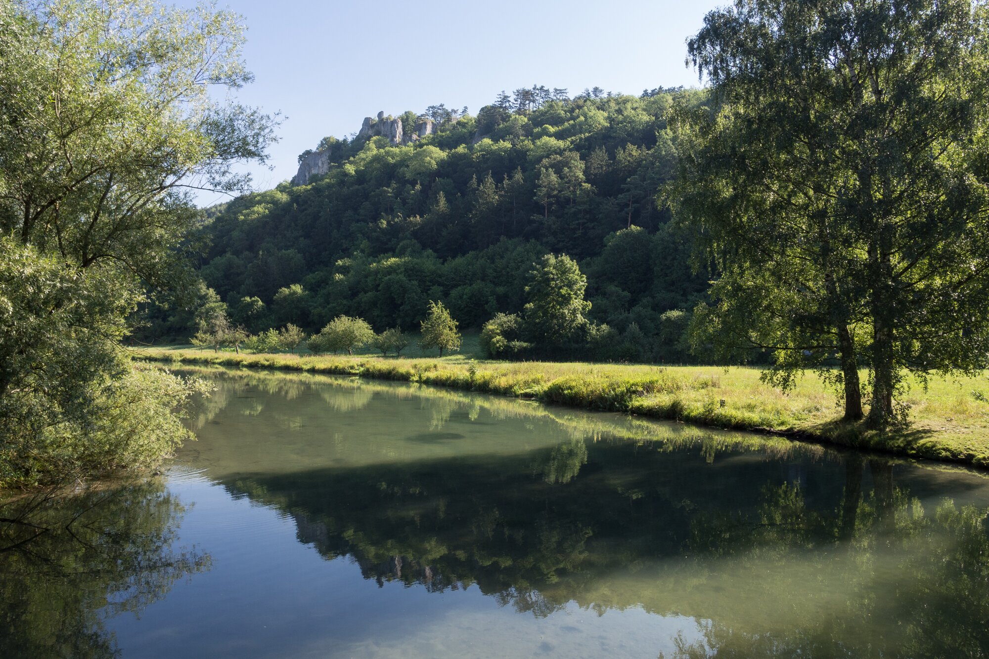 An der Blau. Blick zum Rusenschloss. Wanderung von Blaubeuren Bahnhof zum Rusenschloss. Von dort über den Knoblauchfelsen zum Blaufelsen. Hinunter zur B28. Diese überquerend Aufstieg auf Teerweg bis zur Steigziegelhütte, da Abzweig nach links zum Landeplatz Seißen nicht gefunden. Entlang am Waldrand zur Wegmarkierung. Dieser folgend zur Günzelburg. Von dort zum Felsenlabyrinth und zur Küssenden Sau. Abstiefg zum Bahnhof. Mit dem Auto zum Blautopf.