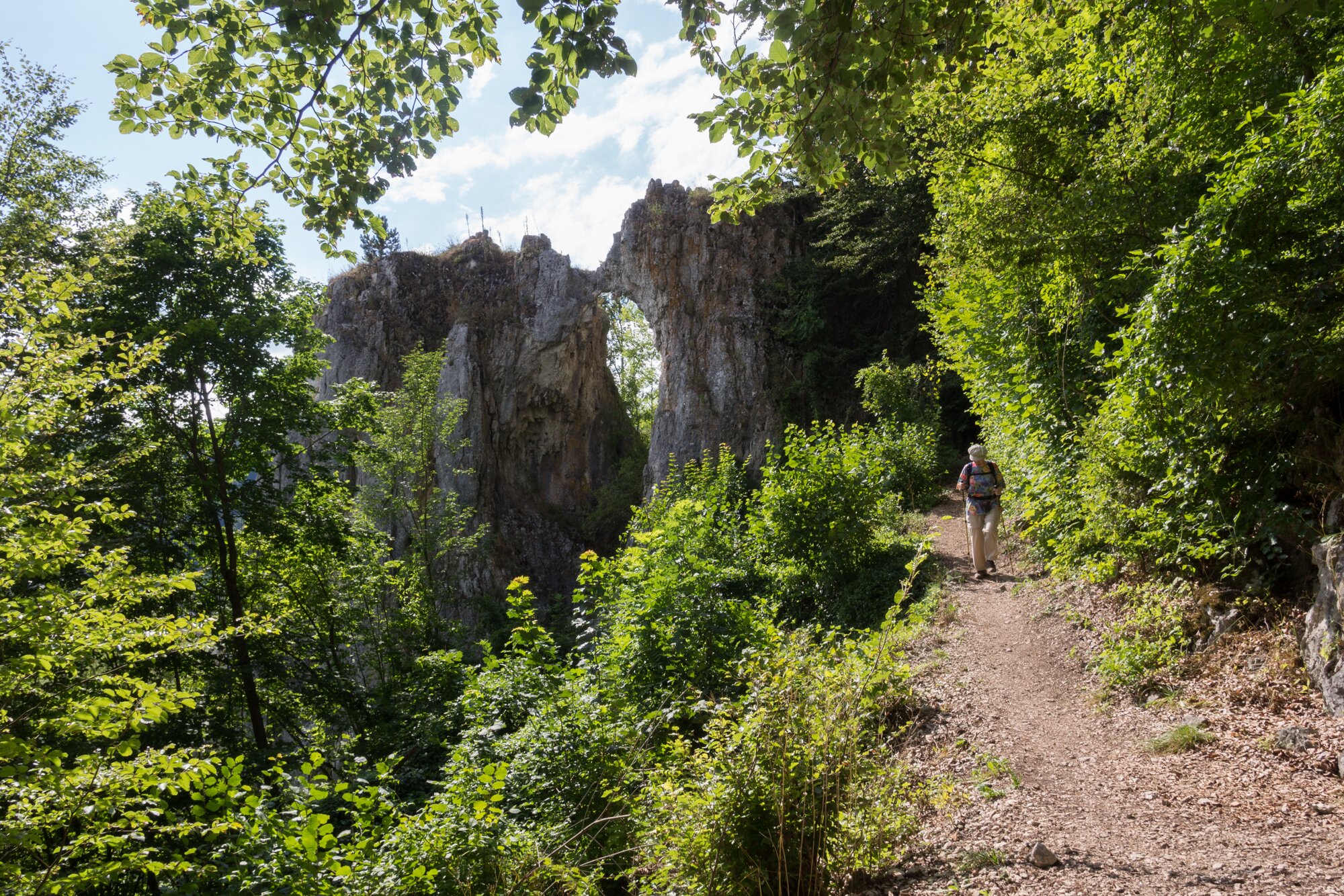 Felsenlabyrinth mit Küssender Sau Wanderung von Blaubeuren Bahnhof zum Rusenschloss. Von dort über den Knoblauchfelsen zum Blaufelsen. Hinunter zur B28. Diese überquerend Aufstieg auf Teerweg bis zur Steigziegelhütte, da Abzweig nach links zum Landeplatz Seißen nicht gefunden. Entlang am Waldrand zur Wegmarkierung. Dieser folgend zur Günzelburg. Von dort zum Felsenlabyrinth und zur Küssenden Sau. Abstiefg zum Bahnhof. Mit dem Auto zum Blautopf.