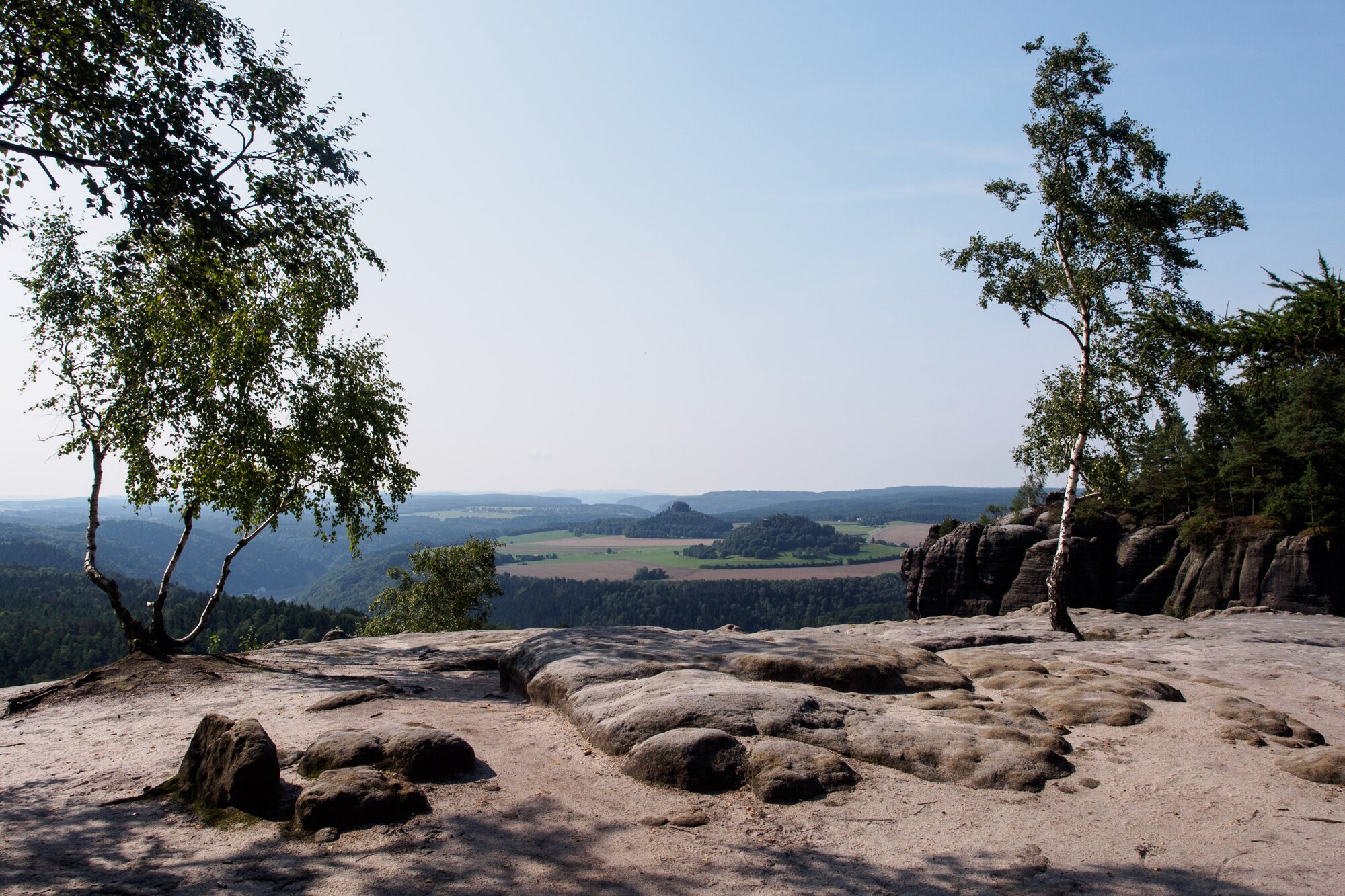 Aussicht Breite Kluft mit Blick zum Zirkelstein und zur Kaiserkrone. Wanderung vom Nassen Grund im Kirnitzschtal zur Domerkeraussicht, weiter zu den Schammsteinen und zurück zum Nassen Grund.
