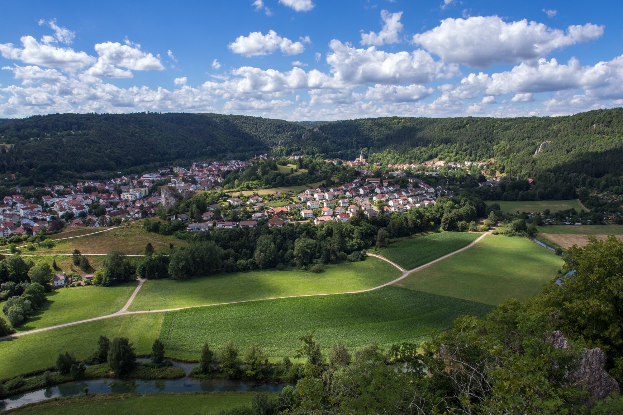 Blick vom Rusenschloss nach Blaubeuren Zugfahrt von Blaustein nach Herrlingen. Wanderung vom Bahnhof Herrlingen über das Rommel-Denkmal und Wippingen zum Rusenschloss oberhalb von Blaubeuren. Von dort Abstieg zum Bahnhof Blaubeuren und Rückfahrt mit dem Zug nach Blaustein.