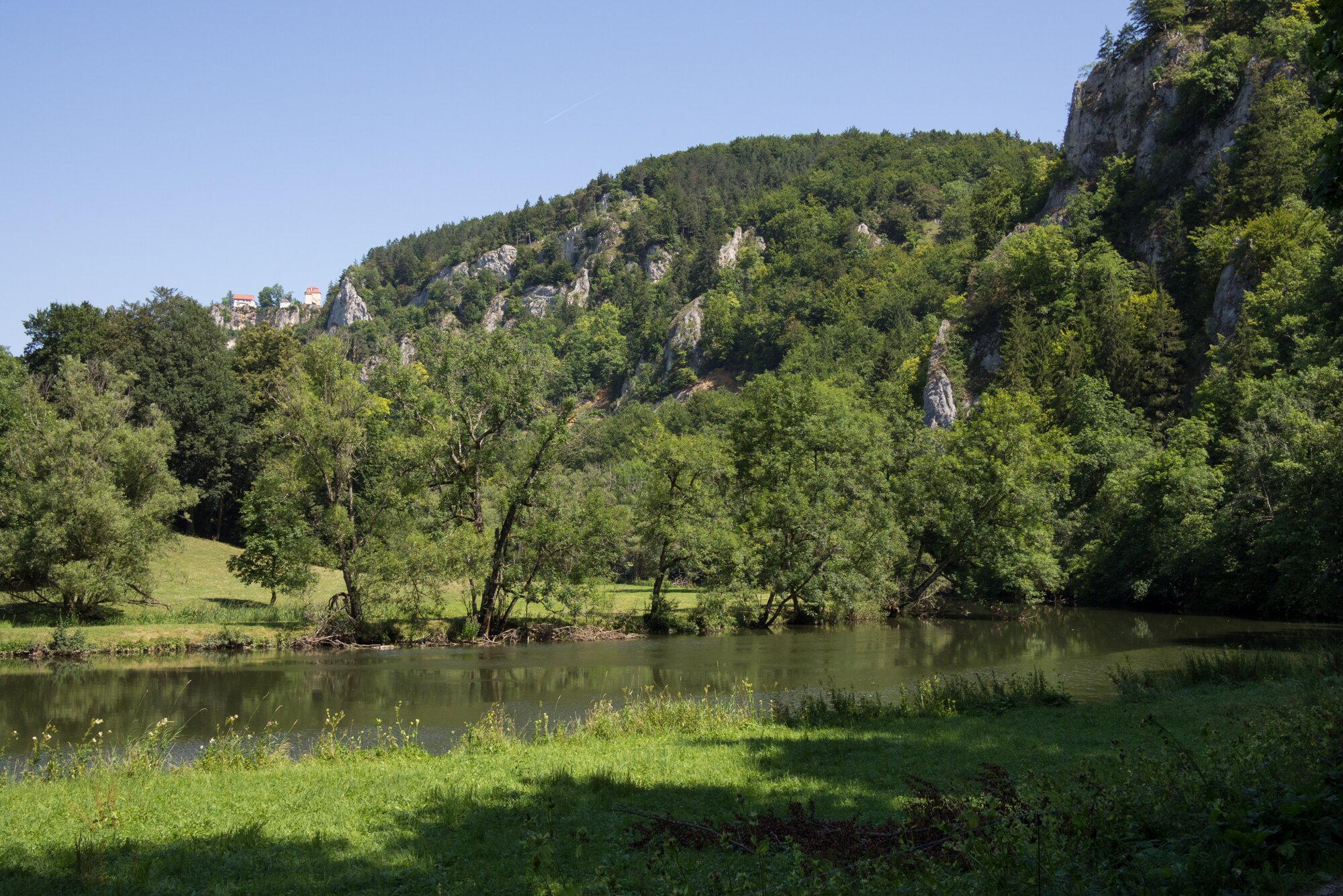 Donautal mit Blick Richtung Schloss Bronnen Wanderung im Oberen Donautal: Route: Start am Kloster Beuron - Knopfmacherfels - Jägerhaus (im Donautal) - Ziegelhütte (im Donautal) - Leibfelsen - Stiegelesfelsen - Knopfmacherfels - Kloster Beuron