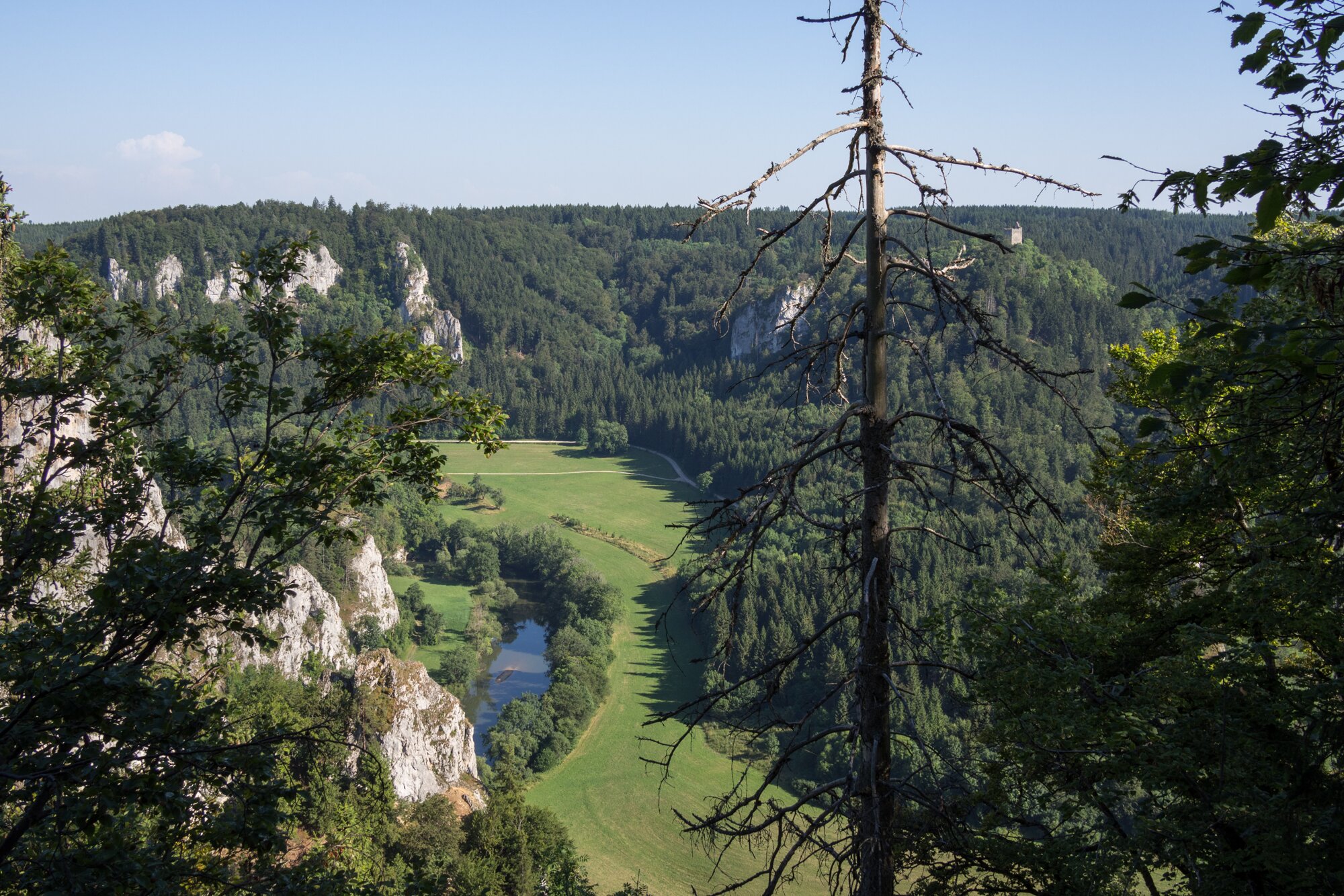 Auf dem Weg zum Stiegelesfels. Blick zur Ruine Kallenberg. Wanderung im Oberen Donautal: Route: Start am Kloster Beuron - Knopfmacherfels - Jägerhaus (im Donautal) - Ziegelhütte (im Donautal) - Leibfelsen - Stiegelesfelsen - Knopfmacherfels - Kloster Beuron