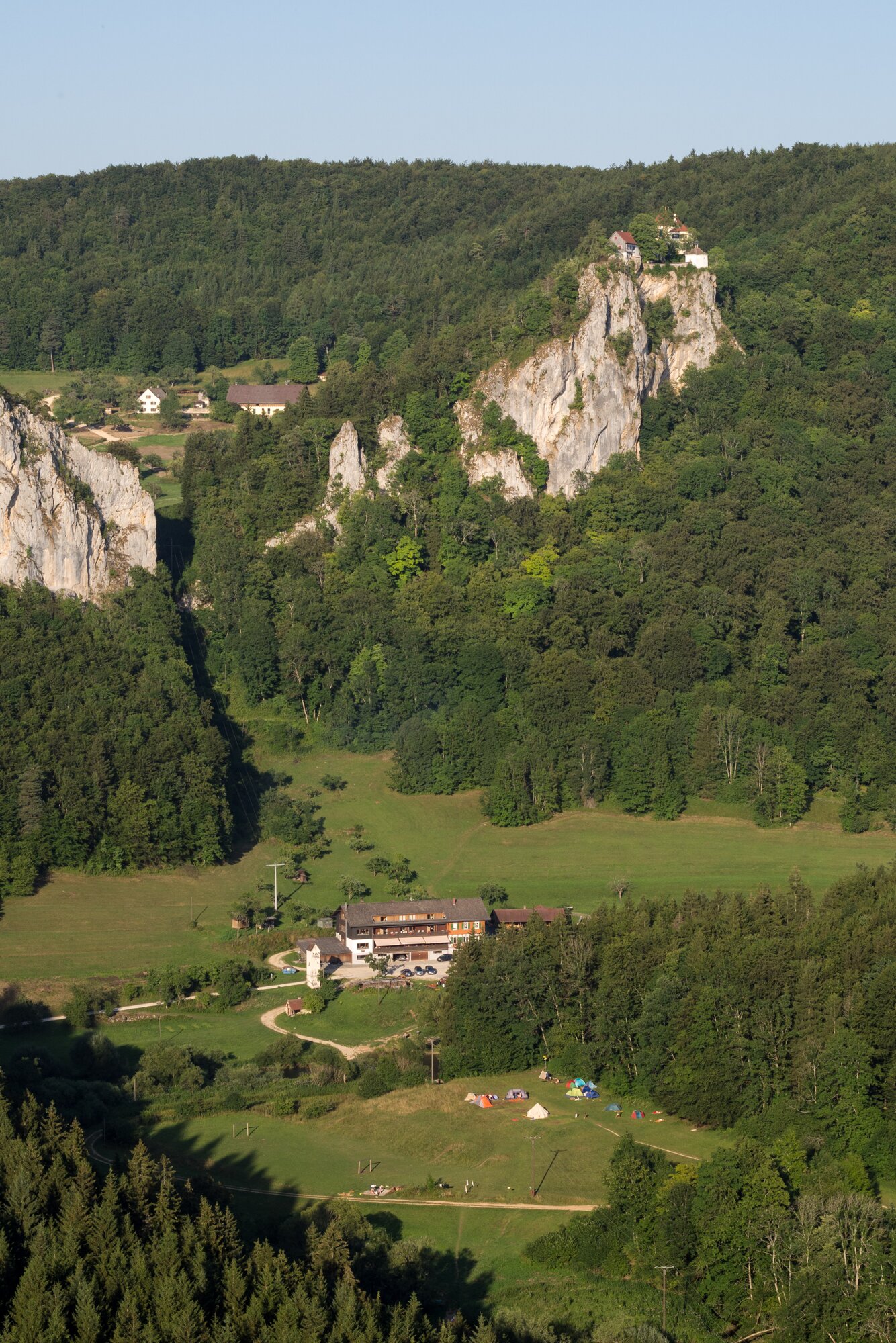 Aussicht Knopfmacherfelsen Richtung Schloss Bronnen Wanderung im Oberen Donautal: Route: Start am Kloster Beuron - Knopfmacherfels - Jägerhaus (im Donautal) - Ziegelhütte (im Donautal) - Leibfelsen - Stiegelesfelsen - Knopfmacherfels - Kloster Beuron