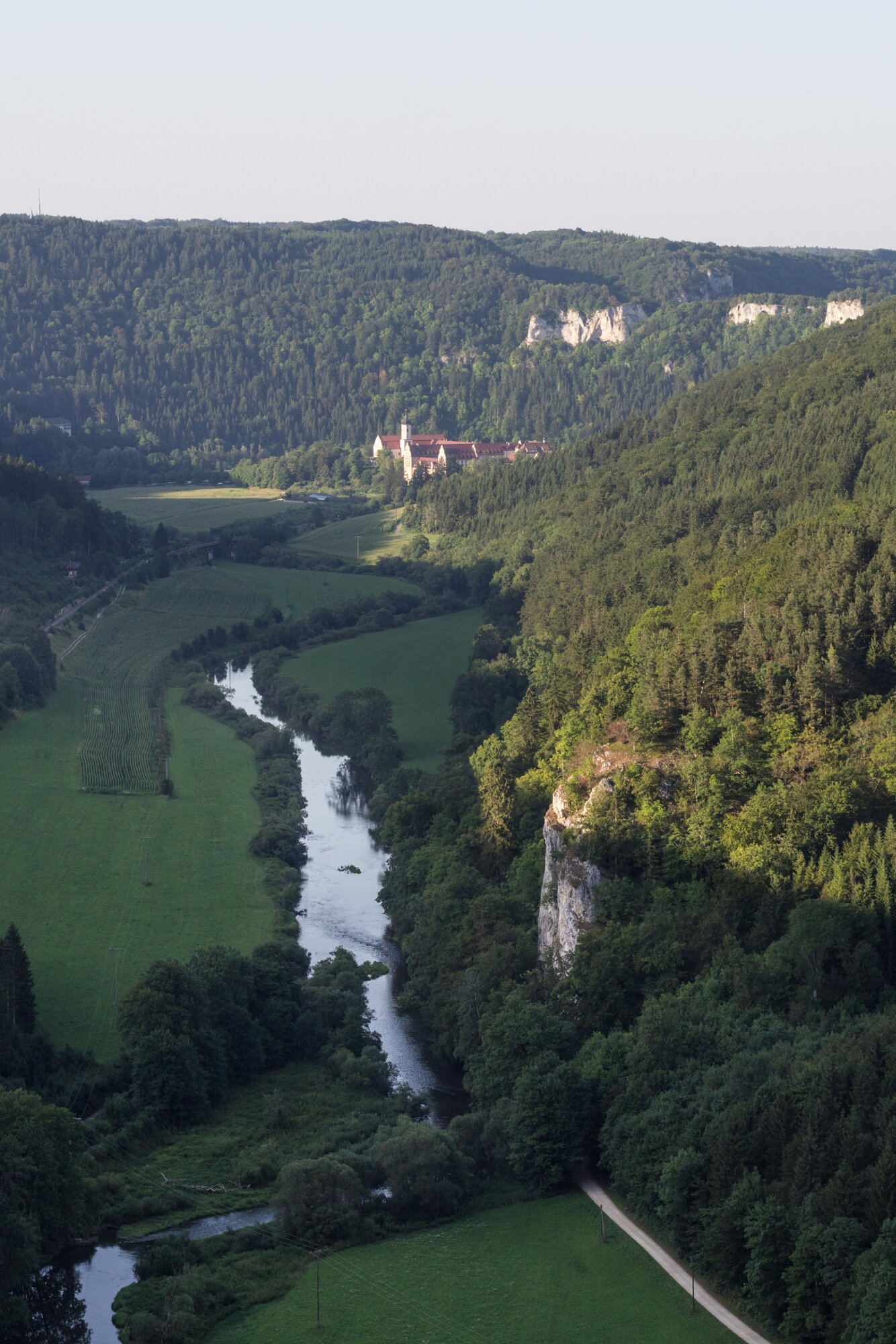 Aussicht Knopfmacherfelsen Richtung Beuron Wanderung im Oberen Donautal: Route: Start am Kloster Beuron - Knopfmacherfels - Jägerhaus (im Donautal) - Ziegelhütte (im Donautal) - Leibfelsen - Stiegelesfelsen - Knopfmacherfels - Kloster Beuron