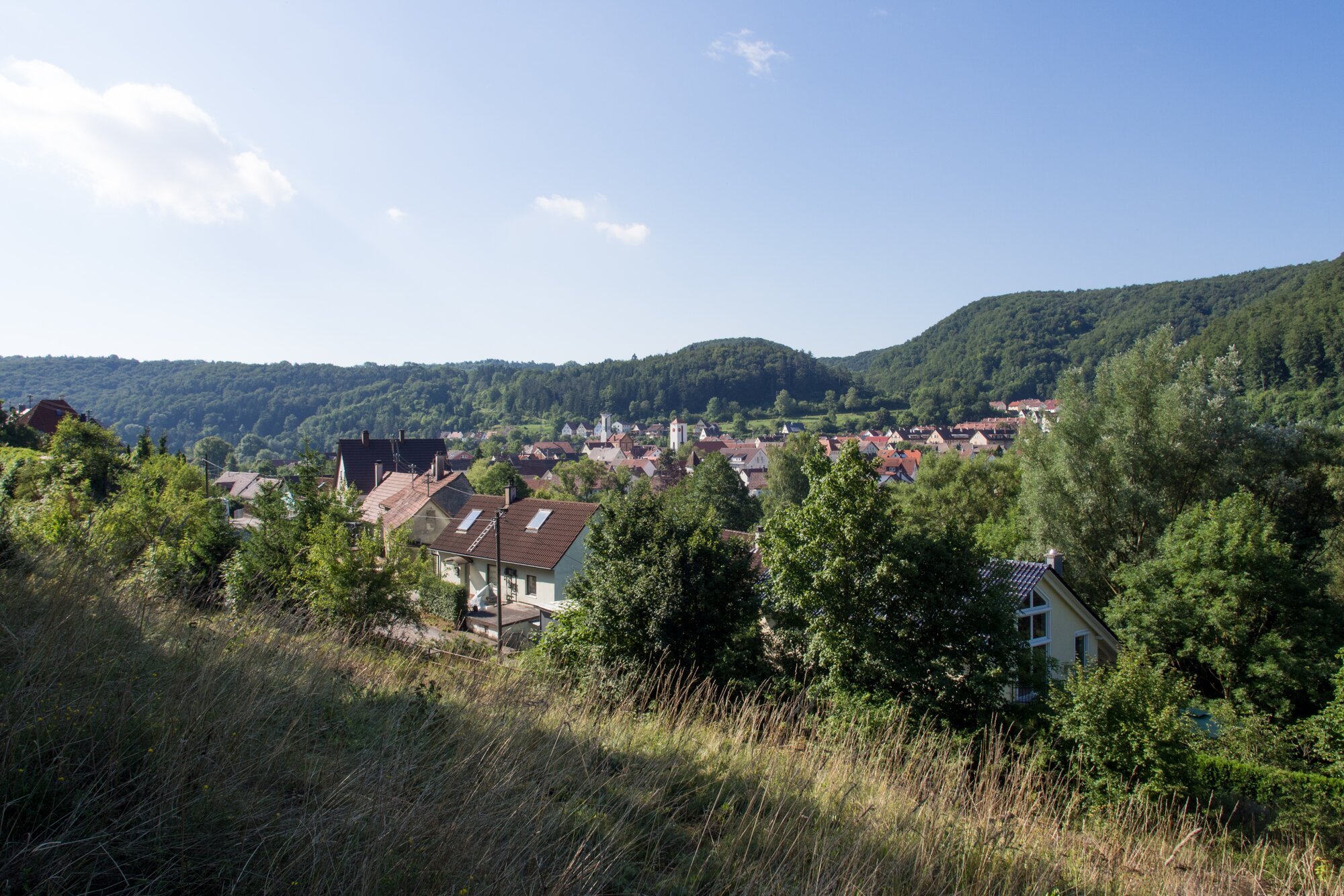 Aufstieg zum Rusenschloss. Blick nach Gerhausen. Wanderung von Blaubeuren Bahnhof zum Rusenschloss. Von dort über den Knoblauchfelsen zum Blaufelsen. Hinunter zur B28. Diese überquerend Aufstieg auf Teerweg bis zur Steigziegelhütte, da Abzweig nach links zum Landeplatz Seißen nicht gefunden. Entlang am Waldrand zur Wegmarkierung. Dieser folgend zur Günzelburg. Von dort zum Felsenlabyrinth und zur Küssenden Sau. Abstiefg zum Bahnhof. Mit dem Auto zum Blautopf.