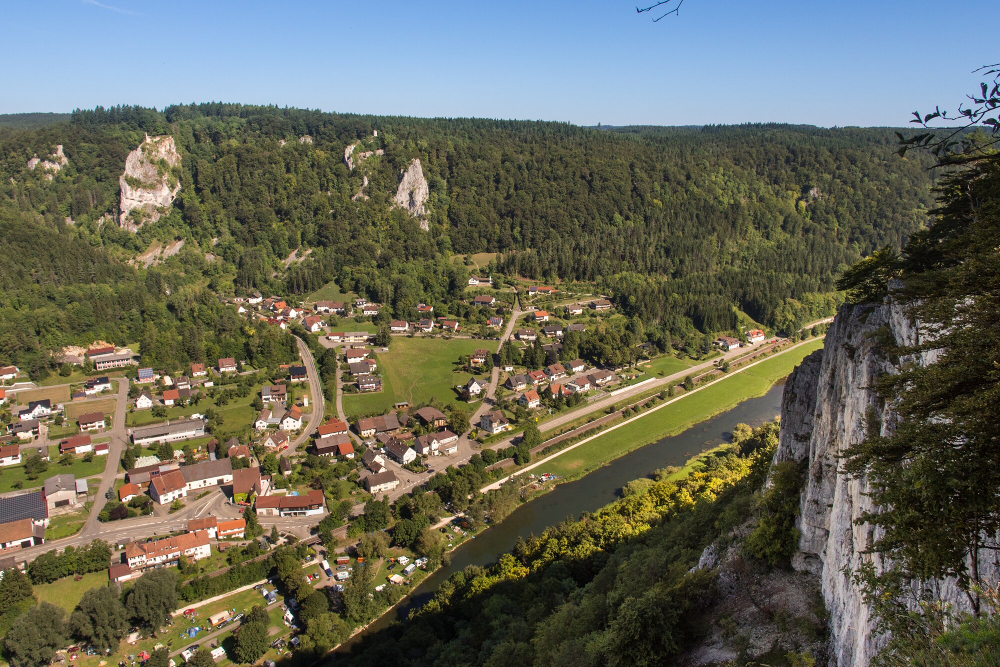 Aussichtspunkt Wagenburg Wanderung im Donautal: Minigolfanlage in Hausen i. Tal. Steilaufstieg zum St. Annafelsen. Ruine Wagenburg mit Aussicht. Lenzenfelsen. Abstieg zur Neumühle. Steilaufstieg zur Ruine Falkenburg. Stielaufstieg zu den Schaufelsen. Über die Steighöfe zurück nach Hausen i. Tal.